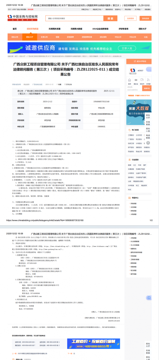 广西壮族自治区桂东人民医院常年 法律顾问服务(第三次)成交结果公告
